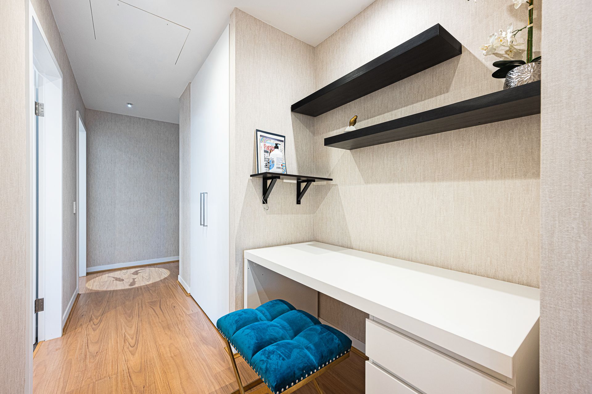 Thoughtful attention to detail is evident throughout the apartment, from the reconstituted stone walls in the bathrooms to the carefully chosen wallpapers and large-format tiles in the living and dining area. The convenience of two car spaces further enhances the appeal of this sophisticated residence.