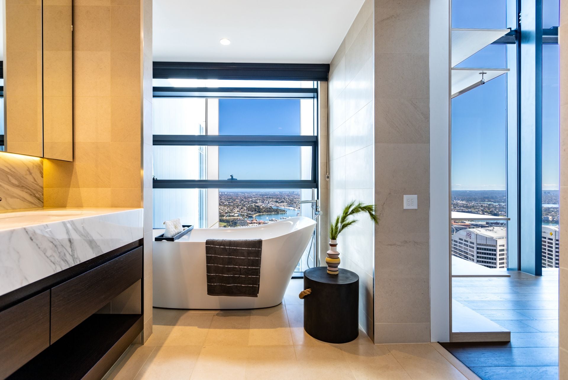 This penthouse expands over 3 floors encompassing a total strata area of 328 sqm. This opulent penthouse offers 3 spacious bedrooms each with own luxury en-suite that provides another view of the city, with multiple angles ranging from Darling Harbour and a panoramic view of Sydney's skyline.